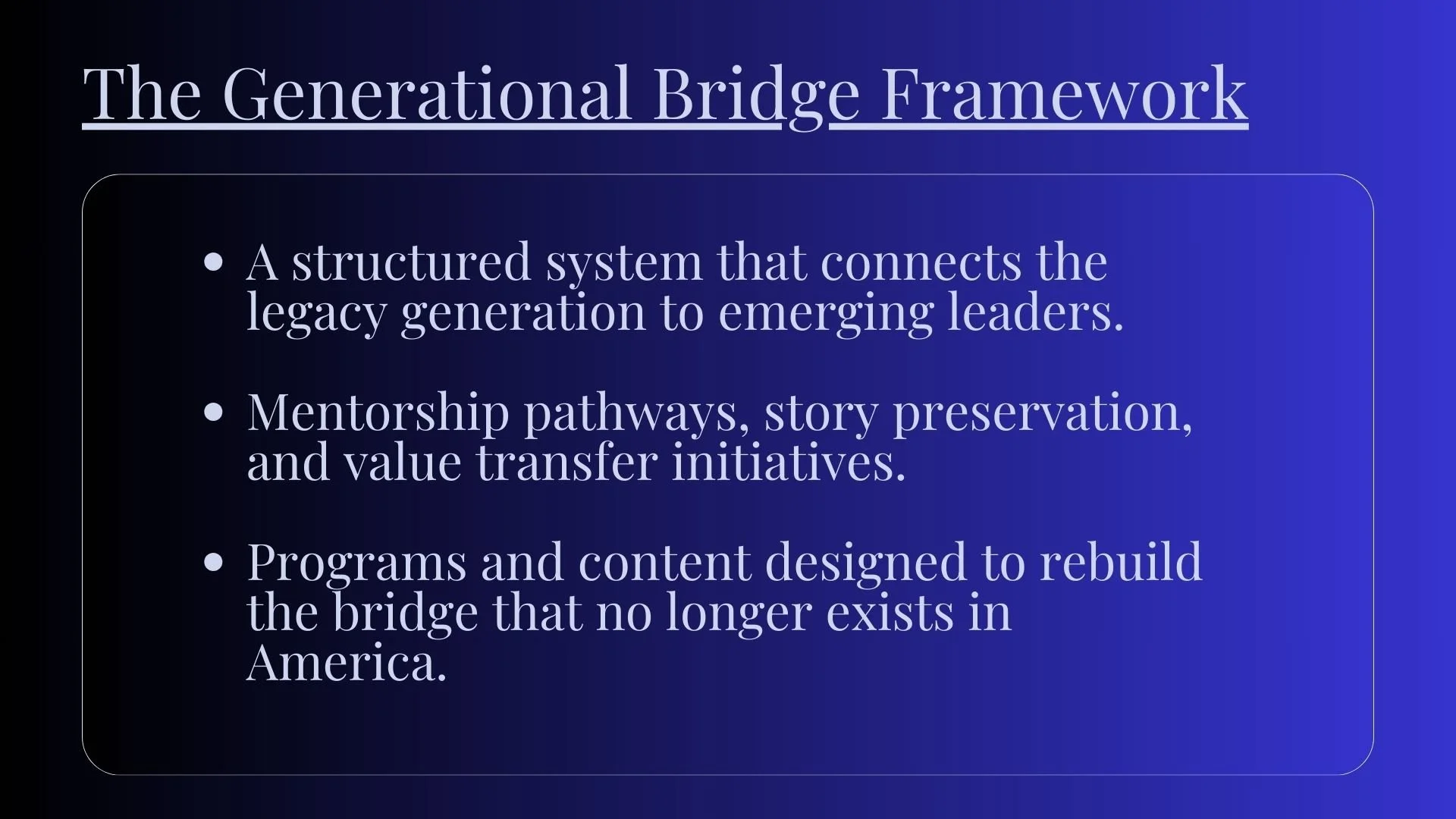 We exist to bridge the generation gap—bringing the wisdom of the legacy generation together with the passion and energy of the next.